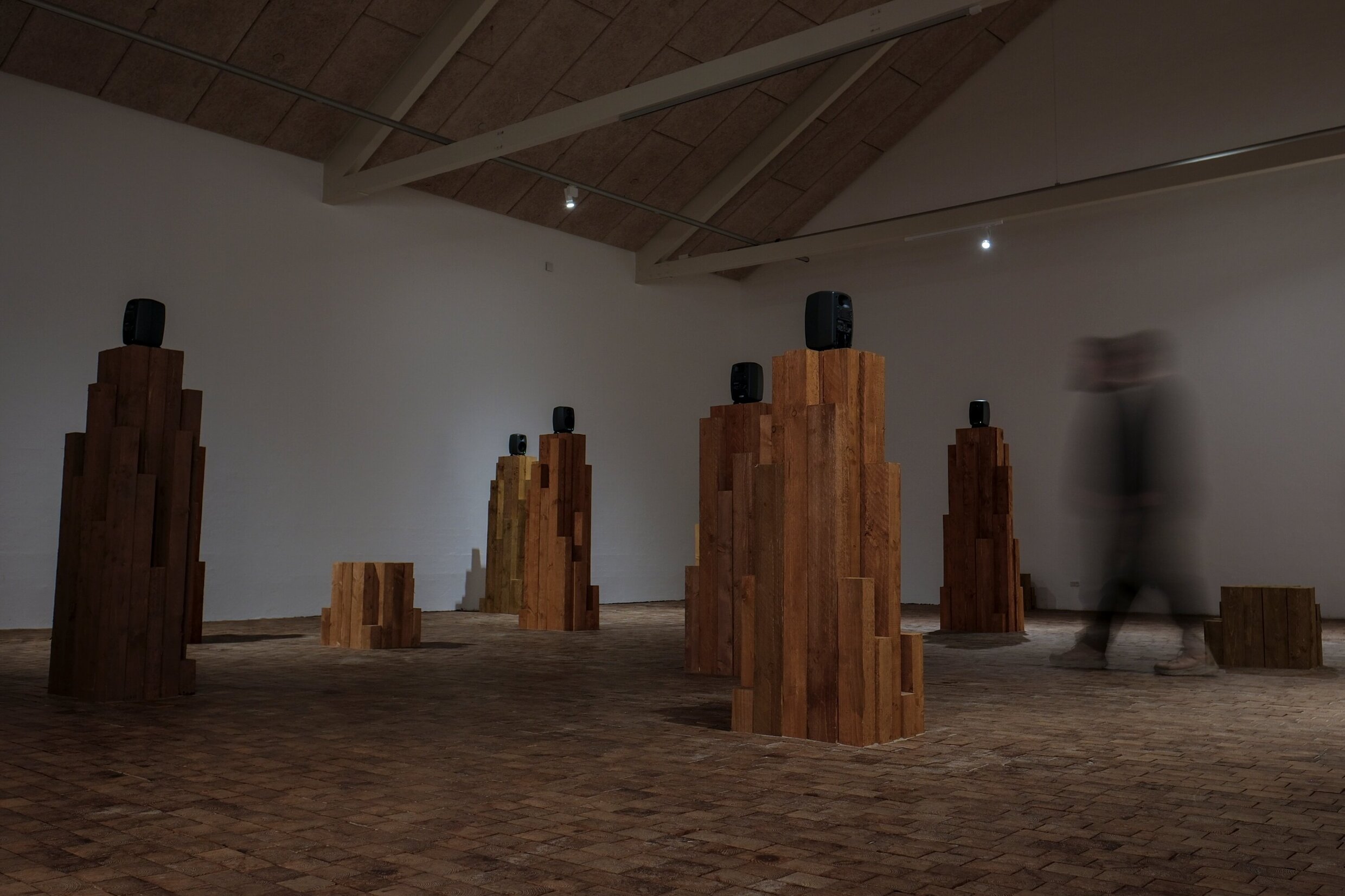 Placing the visitor in the center of the conversation, the speakers are situated on pedestals built from the wooden bricks that comprise the floor of the Jorn Museum. This flooring is set in bitumen, a viscous liquid that moves incredibly slowly. It is an uncontrollable substance that changes shape depending on humidity and temperature, so that the floor of the museum shifts unpredictably over time. In this way, Superconversation reflects not only on utopian ideas for museums, but also on the room that the work occupies.